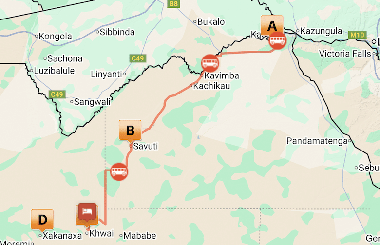 Ends: Kasane or Maun (Opposite to start)