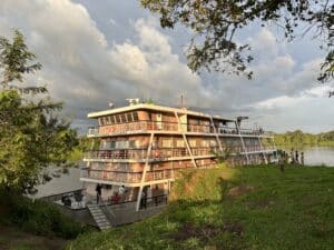 Begin cruising upstream between green hills. Afternoon launch-boat excursion on the Maipili River and time on deck observing the Congo River’s iconic barges and floating villages.