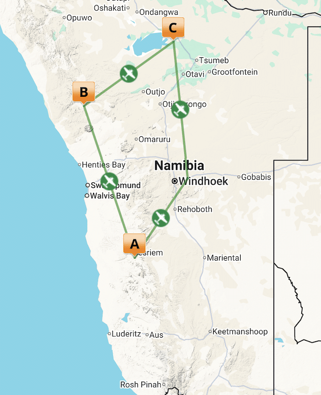 After a final morning activity, fly by private charter back to Windhoek International Airport, arriving in time for your onward international flight.
